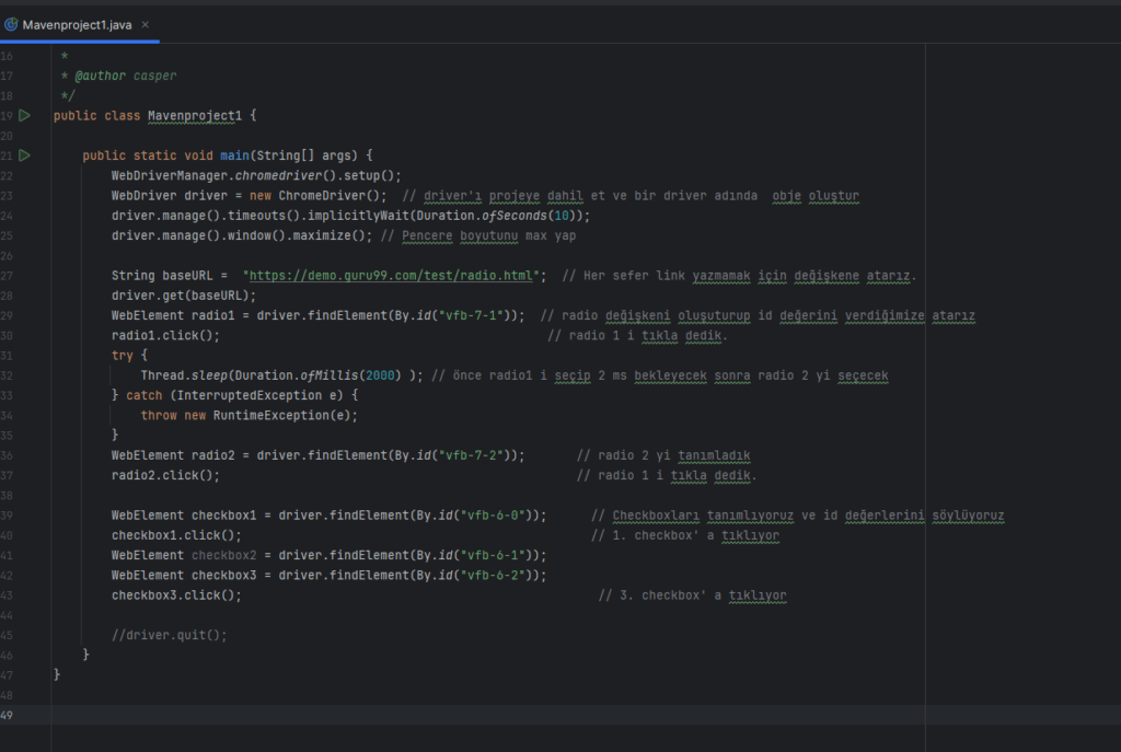 - Selenium ile testleri yazarsın (web işlemleri için).
